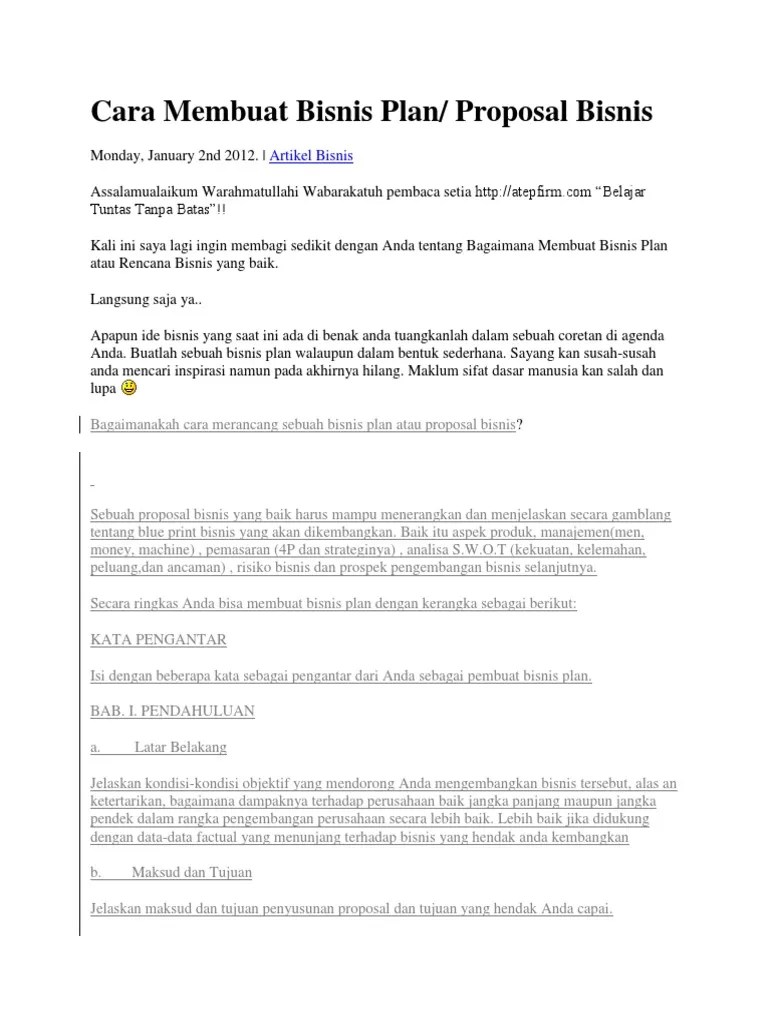 Umumnya, executive summary akan dibuat berbarengan dengan business plan, sehingga akan diletakkan di bagian akhir ketika seluruh rencana bisnis sudah disusun secara runtut dan baik. Ada beberapa langkah yang bisa dilakukan pimpinan saat merumuskan contoh bisnis plan. Bisnis plan adalah rencana tertulis pada bisnis yang sudah didiskusikan sebelumnya tentang bagaimana kegiatan bisnis dilakukan untuk mencapai tujuan bersama. Business plan dapat membantu pelaku bisnis mengevaluasi ide awal dan tujuan yang telah direncanakan dan harus dicapai. 15.04.2019 · tag bisnis plan, business plan, ide bisnis, marketing plan, peluang bisnis, rencana bisnis.